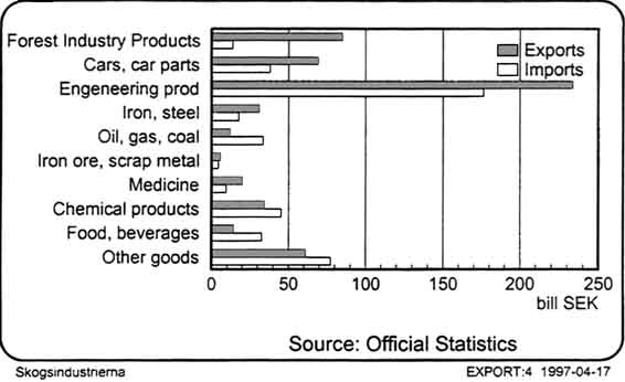 But even if the car industry has an export value which is double that of the forest industry, its export surplus (exports less imports) is only half. This export surplus pays for instance for the import of oil, petrol, food, clothes, computers and much more. In Sweden's export-based economy, the forest industry is the main motor.