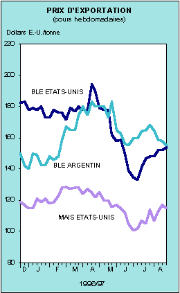 Les cours internationaux du maïs ont généralement augmenté et sont restés fermes ces dernières semaines. A la fin du mois d’août, le maïs se négociait à environ 115 dollars E.-U. la tonne, prix dépassant d’au moins 10 dollars E.-U. la tonne celui du mois précédent, principalement à cause d’une détérioration des perspectives de l’offre, mais restant inférieur de quelque 75 dollars E.-U. la tonne à celui de l’an dernier. La dégradation des perspectives concernant la récolte mondiale de maïs, en particulier aux Etats-Unis, a continué à faire monter les prix, d’autant que les disponibilités provenant de l’ancienne récolte étaient extrêmement réduites. Les prix ont aussi été soutenus par la persistance du temps sec qui a eu une incidence négative sur les cultures en Chine. Les préoccupations actuelles concernant le niveau des récoltes ont eu un impact encore plus prononcé sur le marché à terme (Tableau A.8). A la Bourse de Chicago (CBOT), les contrats à terme concernant le maïs atteignaient des niveaux record, à 3 mois 1/2, le 21 août, et les contrats pour décembre se sont élevés à 109 dollars E.-U. la tonne, soit quelque 13 dollars E.-U. la tonne de plus que les valeurs négociées en juin pour le mois de décembre. Les prix du maïs ont été très instables, conformément à leurs oscillations saisonnières passées et, malgré de récentes hausses, ils ont d’une manière générale tendu à la baisse depuis mars 1997. Néanmoins, les conséquences climatiques défavorables du phénomène El Niño, par exemple pour le blé, pourraient exercer une pression haussière sur les prix, notamment vers la fin de la campagne.