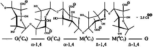 The number and sequence of the Mannuronate and Glucuronate residues shown above vary in the naturally occurring alginate. The associated water molecules are not shown. |