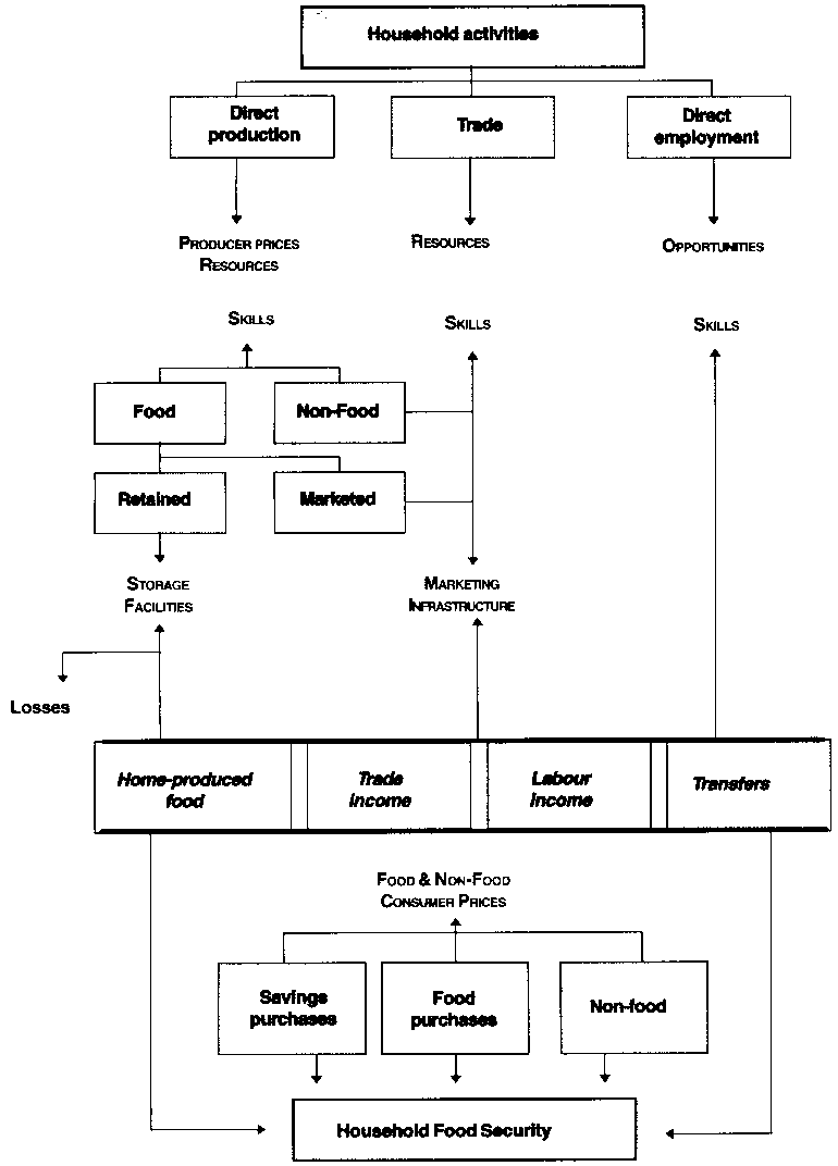 Finally, it is apparent from Figure 1 that the three variables describing access to food at the household level are: (i) home-produced food, (ii) retained receipts from barter transactions or transfers, and (iii) food purchases. Access to food through any of these sources contributes to the availability of food to the household. Access does not, however, ensure efficient utilisation and says nothing regarding intra-family distribution, both of which can have a profound effect on nutritional status regardless of food availability.