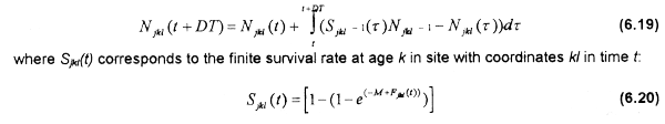 where M is the instantaneous natural mortality rate and Fjkl(t) is the age specific fishing mortality rate in site kl in time t, estimated by the product of the age-specific qj by the intensity of fishing exerted in site kl in time t (fkl(t)).