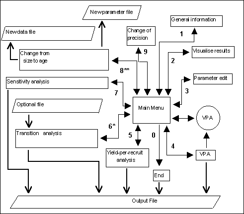 All options, except for the first one, are interactive. The first two only give information to the user. Options 3 and 4 allow for parameter modification. Options 4, 5, 6 and 7 conduct analyses whose results are written into the output file. Option 8 creates new parameter and data files, and option 9 (hidden) allows modification of the precision of VPA calculations.