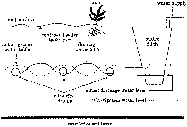 There are two forms of water table management: controlled drainage and sub-irrigation. Controlled drainage restricts the discharge from a subsurface drain outlet or open main drain, resulting in a higher field water table. The water table drops naturally over time due to evaporation and deep seepage, and is only raised if there is precipitation. With sub-irrigation, water is pumped slowly and nearly continually into open ditches or a subsurface drainage system to maintain a near constant water table. When large rainfalls occur and the field water table rises above the desired level, the irrigation pump is stopped. The excess water then drains from a control structure in the ditch or drain outlet. Such systems are shown in Figure 3.