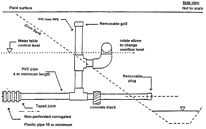 Water table management requires periodic monitoring of the water table at the midpoint between drain laterals or ditches. It is best done by the farmer. One observation well per field is the minimum recommended. For a given soil and drain spacing, the frequency of observation and adjustment of the control structure depend mainly on the weather and crop development stage. For example, when crops are in their early stages of development, a shallow water table may impede proper root development, and this could make the crop more susceptible to drought later in the year. Research by Madramootoo et al. (1993 and 1995) indicates that water table levels between 0.50 m and 0.75 m from the soil surface are appropriate for most crops.