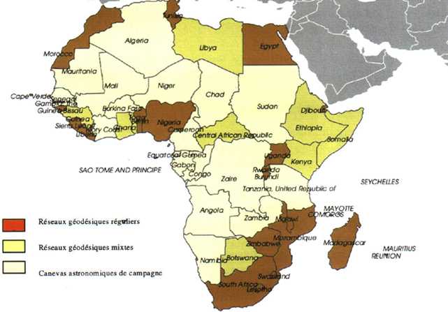 Les réseaux de triangulation réguliers se trouvent dans les pays d'Afrique australe et dans les pays du Maghreb. Les pays qui ont un réseau mixte comportant des zones avec triangulation et de plus larges secteurs seulement couverts par des points astronomiques concernent des pays de toutes les sous-régions (Ethiopie, Somalie, Kenya, Botswana, RCA, Ghana, Guinée). Enfin une majorité de pays d'Afrique ne sont pourvus que de réseaux géodésiques partiels ou simplement basés sur des campagnes de points astronomiques. Il s'agit essentiellement de l'Afrique centrale, de la zone sahélienne et du sud-ouest du continent.