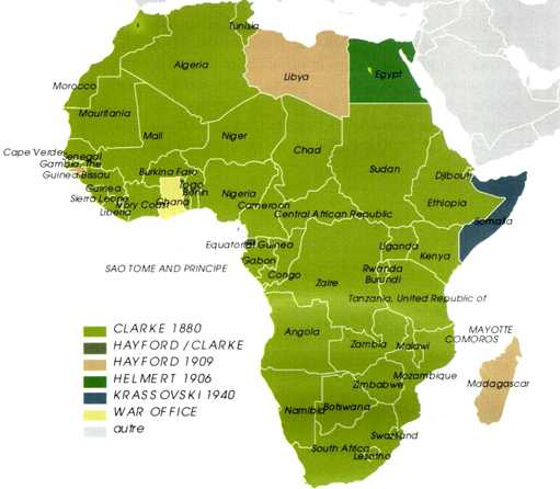 Les modèles géométriques de représentation décrivent au mieux la forme générale de la terre en fonction de deux critères: l'ellipsoïde qui est une modélisation mathématique approchant au mieux la forme du géoïde, et la projection géométrique que l'on opère sur cet Ellipsoïde, car on ne peut représenter une forme sphérique ou pseudo sphérique directement sur un plan cartésien. On utilise le plus souvent un modèle d'ellipsoïde en fonction de la zone terrestre pour laquelle celui-ci a été élaboré en cartographie classique (Everest utilisé dans le sous-continent Indien et en Asie du sud-est, Krassovsky utilisé en Russie et dans les pays de l'ancien bloc socialiste...). Ces modèles sont généralement reliés à l'histoire cartographique dans les différents pays. Le continent africain est largement cartographie sur le modèle de l'ellipsoïde de Clarke avec ses variantes élaborées depuis la fin du XIXème siècle et utilisées encore aujourd'hui. On retrouve ce type de référentiel en Afrique australe comme en Afrique centrale, dans la zone Sahélienne et le Maghreb. Le passage d'un référentiel à l'autre se fait par des algorithmes de calcul prenant en compte les axes majeurs et mineurs, les coefficients d'aplatissement des différents ellipsoïdes utilisés.