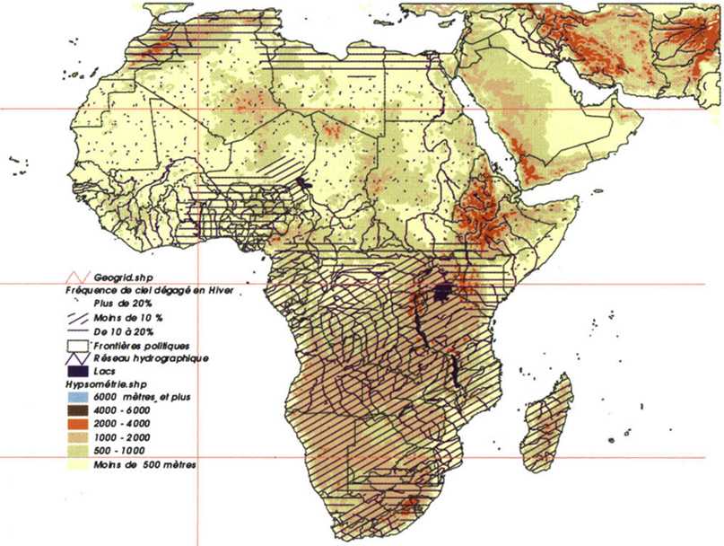 De l'inventaire des ressources cartographiques présentes sur les pays du continent, il apparaît que 20% seulement des pays sont couverts par des cartes régulières basées sur des réseaux de triangulation, 30% sont couverts par des cartes semi-régulières et 50% ne dispose que de points astronomiques.
