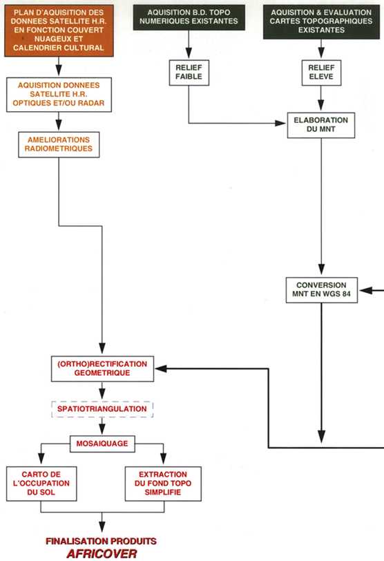 i) Inventaire et acquisition des cartes topographiques et éventuellement réédition des planches mères originale quand leur qualité le permet.ii) Acquisition des images satellite et réalisation des prétraitements radiométriques et géométriques selon les étapes décrites dans le schéma en fin de ce chapitre. Ces traitements seront bien entendu fait à partir du référentiel géométrique préparé selon les méthodes discutées précédemment.