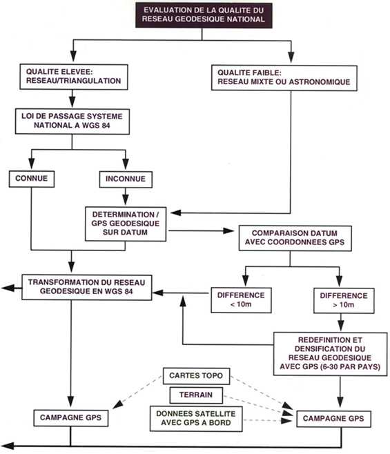 Pour chaque point, une comparaison sera faite entre les coordonnées des anciennes données et celles mesurées dans le système WGS84. Si la différence est inférieure à 10 m, l'ancien système est alors acceptable et il devra être transformé en WGS84. Autrement, les points qui présenteraient une erreur de plus de 10 m, devront être à nouveau calculés dans le datum original selon les méthodes classiques -(triangulation/trilatération, etc.). Une fois que l'ancien datum est corrigé, il sera transformé en WGS84. Ce travail sera accompli pour chaque pays.