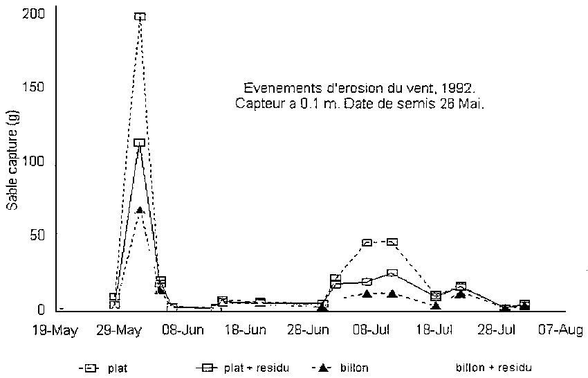 A Sadoré, au cours de la saison culturale 1992, nous avons quantifié des flux de sol provoqués par les tempêtes (saltation) en fonction du labour et des résidus de culture, sur sols sablonneux (92% de sable). Nous avons testé deux traitements de travail du sol pré-semis; le travail du sol superficiel (méthode locale) et le billonnage. Le travail du sol est effectué après que les premières pluies aient mouillé le sol à une profondeur de labour (10 mm de précipitations dans le cas du billonnage). Les deux traitements ont été testés avec ou sans 2 tonnes/ha de pailles de mil étendues sur le sol. Le mil a été planté à des interlignes de 0,75 m sur les billons. Trois échantillonneurs BSNE par parcelle, à une hauteur de 0,1 m (ouverture des échantillonneurs de 10 cm2) ont été utilisés afin d'intégrer le taux de saltation par tempête. La tempête du 1er juin a duré 18 minutes, et la vitesse du vent dépassait 5 ms-1 (Fig. 10).