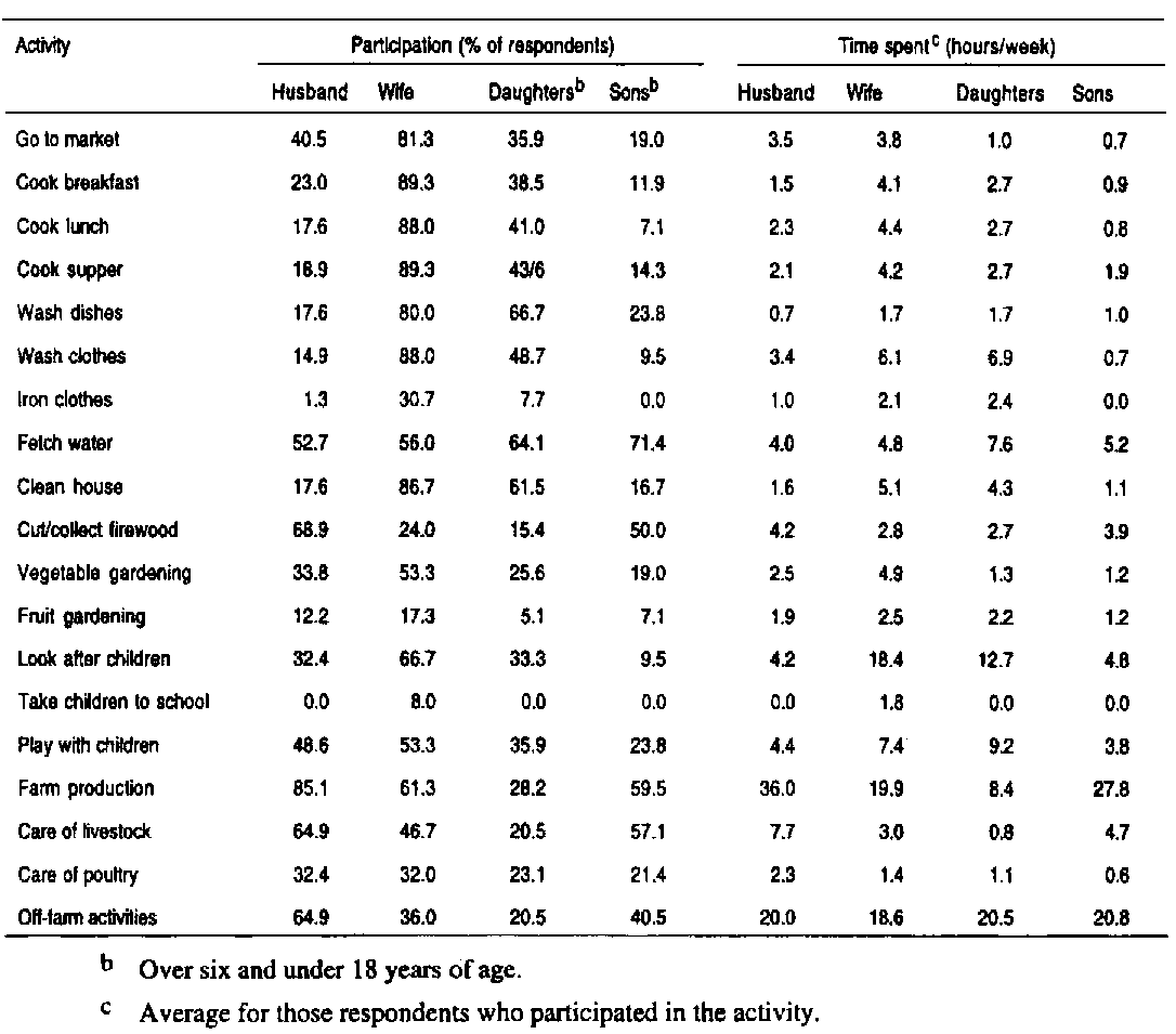 As noted above, sound farm planning often necessitates an understanding of how resources, responsibilities, tasks and benefits are distributed between the men, women and children of the farm household. This is the subject of gender analysis as discussed and illustrated by, e.g., Feldstein and Jiggins (1994), Feldstein, Flora and Poats (1990), Gondowarsito, van Stanten and Bottema (1995), Quisumbing et al. (1995) and van Herpen and Ashby (1991). The need for gender analysis, particularly in relation to the role of women in the farm-household system, is well illustrated by the following response by a small farmer when interviewed in a farm survey (Gabriel 1995, p. 68):