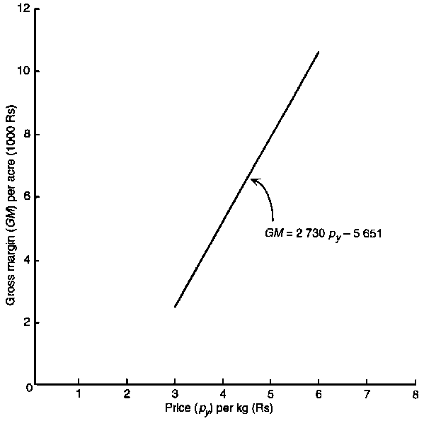 GM = TR - VC = (Yield/acre)(Price/kg) - VC = (Y)(py) - VC = 2 730py - 5651