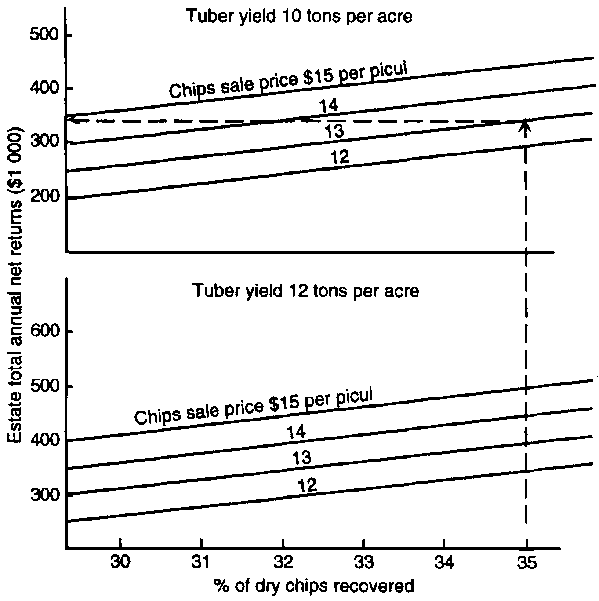 The unstable parameters of concern to management on this particular estate are: annual field yield of fresh cassava tubers per acre, the percentage of dry processed chips recovered per ton of wet tubers, and the sale price of dry chips. The graphs of Figure 4.6 show how the results of a base budget for this enterprise might be parametrized in order for the budget to be 'solved' for any combination of the three unstable parameters: e.g., at a yield of 10 tons per acre, with a chips recovery rate of 35% and a chips sale price of $13 per picul4, total annual net returns for this particular West Malaysian estate would be approximately $330 000. Analogously to the case of single-variable parametric budgeting (Figure 4.5), the graphs of Figure 4.6 are based on the net returns equation
