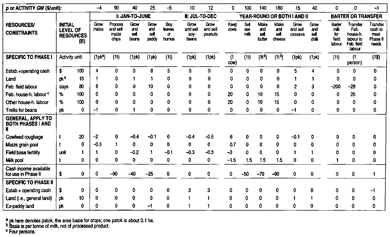 In contrast to the situation depicted in Table 9.9, some of the activities of Table 9.11 now have a time dimension, or are time-specific in terms of some of their resource requirements. As shown in the table, the farm's activities fall into four groups: five wet-season activities which need Phase I resources; two dry-season activities which need Phase II resources; a third group of six activities which continue through most of the annual cycle and require both Phase I and II resources; and a fourth group of three barter or transfer activities whose time relationships vary.