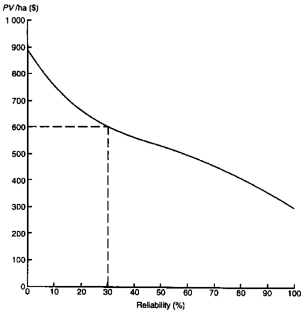 An income-reliability schedule such as that of Figure 11.11 might be used as follows. The farmer or analyst would specify the level of reliability he or she demanded of the activity before undertaking to invest in it. This might be 80 per cent. He or she would then use the curve to read off the minimum PV of net returns per ha to be expected with this level of reliability. At 80 per cent this is about $400. If this particular return-reliability combination is satisfactory in the eyes of the farmer he or she would go ahead with the banana activity; if it is not, then he or she would seek some alternative investment.