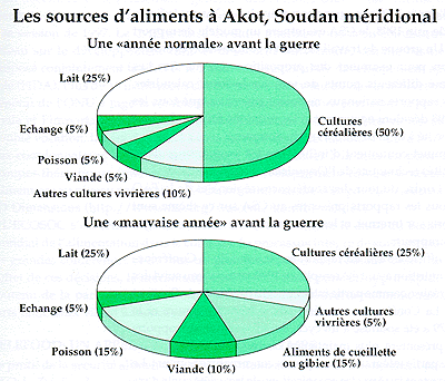 L'analyse de l'économie alimentaire des ménages est une méthode qui permet d'évaluer les besoins des régions ou des groupes de population confrontés à une insécurité alimentaire aiguë. Mise au point par Save the Children (SCF), la méthode s'appuie sur la connaissance des options offertes aux populations pour s'assurer l'accès à la nourriture. Elle va beaucoup plus loin que les évaluations fondées sur la production en étudiant les autres sources de nourriture sur lesquelles peuvent compter les populations, et dans quelle mesure ces sources peuvent être élargies en cas de crise. En période de vaches maigres, la population peut-elle augmenter sa consommation d'aliments de cueillette et de gibier? Ou un membre de la famille peut-il partir chercher du travail ailleurs? Les ménages touchés peuvent-ils s'adresser à des parents plus aisés pour obtenir des cadeaux ou des prêts qui les aideraient à se tirer d'affaire? Ou disposent-ils de stocks vivriers ou d'autres avoirs sur lesquels ils peuvent prélever? Les résultats de l'analyse figurent dans le diagramme en secteurs de la page 17 concernant la région d'Akot, au Soudan, frappée par la guerre. En se concentrant sur les mécanismes utilisés pour avoir accès aux aliments, l'analyse peut suggérer des interventions autres que l'aide alimentaire, destinées à soutenir et non à remplacer les initiatives locales. Elle peut aussi aider à cibler l'aide, car elle permet de mieux identifier les personnes vulnérables et les raisons de leur situation.