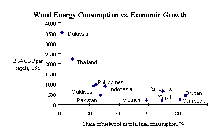 It is also no coincidence that the shares of fuelwood in total final energy consumption in Malaysia and Thailand are less than 10%, the lowest among the other countries under study. These countries have had better access to the more energy efficient modern fuels and at the same time can afford to use them.