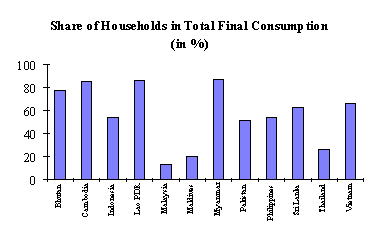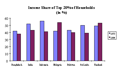 Yet, these relationships are only true at the aggregate level. The gross measures of economic performance (i.e. GNP per capita, GDP growth rate) are averages and do not reflect properly household income. The picture could change tremendously if income distribution is taken into account. In an earlier section, it was shown that more than 40% of household income go only to the top 20% households, while the bottom 20% households get only less than 10% of income. Data show that during the last 20 years or so, income distribution in the RWEDP member countries has not improved significantly. It has in fact deteriorated in Thailand and Malaysia (Figure 4.5).