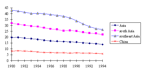 Share of Fuelwood in Total Energy Consumption, 1980-1994 (%)