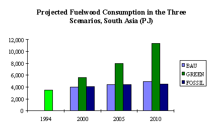 The GREEN scenario also makes an inherent assumption about availability of and accessibility to fuelwood supply. In effect, it assumes that fuelwood supply will be made sustainable through improved forest management (and fuelwood collection) practices and increased fuelwood output from non-forest lands, thus addressing simultaneously the problems associated with fuelwood collection (e.g. spending too much time in fuelwood collection and collecting from distant sources).