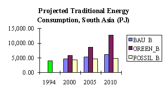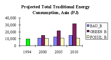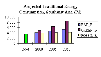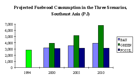 The second and third scenarios represent probably the extremes. The second, called the "green" energy (GREEN) scenario, assumes future fuelwood consumption that is higher than what will be projected in the business-as-usual case. This implies increasing fuelwood consumption that is a result not only of growing population but also of some deliberate attempt to promote fuelwood use because of its positive environmental implications. Though fuelwood combustion actually contributes to global warming, this is offset by forests and trees, from where fuelwood is sourced, that serve as carbon sink, making fuelwood combustion carbon neutral. This scenario makes a rather "heroic" assumption about the behavior of energy consumer. In general, consumers that can choose from an available mix of fuels would prefer modern commercial fuels because these are more convenient to use, more accessible, and cleaner in terms of contribution to indoor air pollution. Over time, access to modern fuels will have improved and consumers will have improved their capacity to buy these fuels. The green energy scenario, therefore, requires an effort to counter this strong tendency from energy consumers.