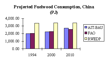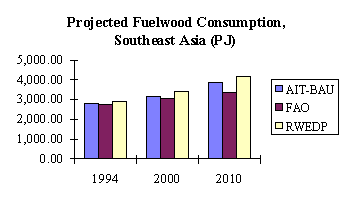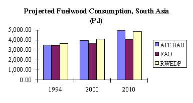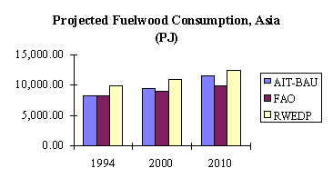 Fuelwood consumption projections will be made based on these three scenarios and using FAOs database for total fuelwood consumption. FAOs database was preferred over those of the UN and AIT because it covers all countries, except Maldives, with a higher degree of consistency than both UNs and AITs. Using FAOs database also facilitates making regional overview and cross-country comparisons because they are available for almost all countries under study. However, it should be noted that these estimates refer only to fuelwood supply from forest lands. But because the concern is the implications of future wood energy use to the forestry sector, the exercise will still be useful even if in many countries a big share of fuelwood supply comes probably from non-forest lands.