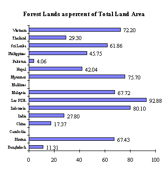 Forests and other wooded lands comprise 31.4%, equivalent to 552.8 million hectares, of the combined land areas of the countries under study (except Cambodia and Maldives) (FAO, 1997). Figure 5.1 shows that forests and other wooded lands make up a huge portion of the total land area in Bhutan, Indonesia, Laos (which is more than 90% covered by forests), Malaysia, Myanmar, Sri Lanka, and Vietnam. To some extent, forests still thrive in Nepal and the Philippines. In Pakistan, forests account for less than 5% of total land area.