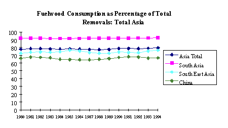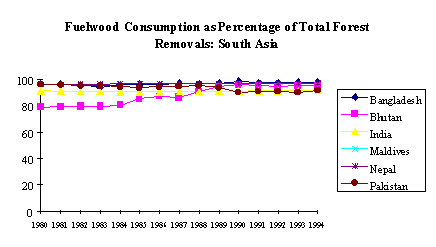 Figure 5.2 (referring to Table A.1.2 of Appendix 1) shows that, on average, between 77% and 79% of total forest removals in the region are indeed accounted for by fuelwood consumption during the period 1980-1994. The countries in South Asia have the highest proportion, averaging 92% during the same period. Except for Bhutan, the shares in the individual countries in the sub-region have been steady indicating that forests have been a "steady" source of fuelwood supply in these countries (Figure 5.3). The same can be said of China which had around 70% of its total forest removals being accounted for by fuelwood consumption (Figure 5.2).