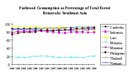 It is known for a fact that forests are an important source of fuelwood. However, information on actual forests contribution to fuelwood supply are hardly available. Recent studies, on the other hand, have mentioned that non-forests lands have become a more important source of fuelwood in many cases. Information are available, though, only for India, Pakistan, and the Philippines as presented in Chapter 3. Nevertheless, data from FAO show that fuelwood consumption still represents a very significant or high proportion of total removals from forests. Ironically, this is true, more than in the other countries under study, for India and Pakistan where more than 90% of total forest removals are estimated to be accounted for by fuelwood consumption.