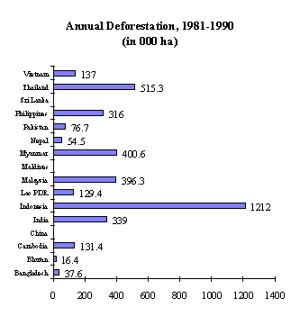In 13 of the RWEDP member countries, FAO (1993) records the rate of deforestation to be in the order of 3.76 million ha per year between 1981 and 1990. The rate is fastest in Southeast Asia, especially Indonesia (Figure 5.5).