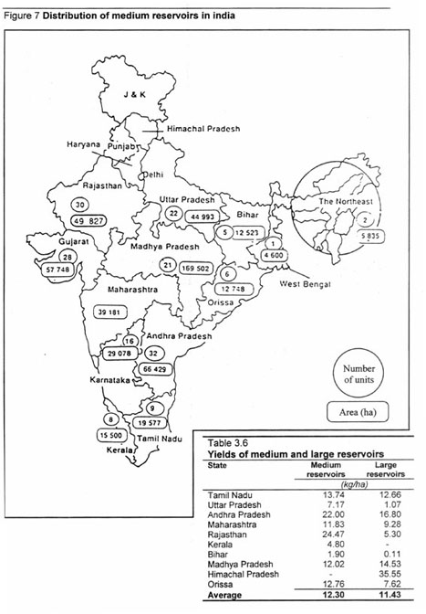 3.4 Reservoir fisheriesIn India, reservoirs are considered the prime resource as regards capture fisheries and extensive aquaculture. The rivers, estuaries and other natural water bodies are threatened by increasing environmental degradation. With the great emphasis on conservation, there is little scope for a substantial increase in yields. The reservoirs, which already cover 3 millionha of surface area, are a growing resource with enormous potential for yield augmentation. The available estimates made by various agencies are conflicting and inaccurate. The most recent study (Sugunan, 1995) estimated the combined surface area of all reservoirs, irrespective of size, as 3135366 ha. Enumeration of the medium and large reservoirs in India is a relatively easy task as there are fewer of them and the details are readily available from the irrigation, power and public works authorities. However, compilation of data on small reservoirs is a tedious task as they are ubiquitous and too numerous to count.