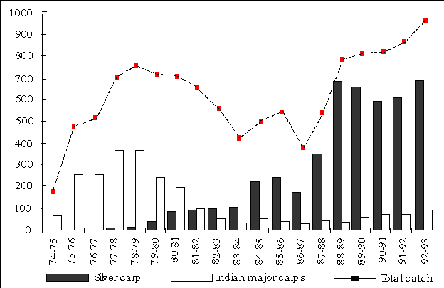 The idea of stocking silver carp in reservoirs was abandoned following experimental introductions in the Kulgarhi (Madhya Pradesh) and Getalsud (Bihar) reservoirs. The most impressive reported performance of silver carp was in the Gobindsagar reservoir, where, following an accidental introduction, the species formed a breeding population and brought about a phenomenal increase in fish yields. Silver carp was instrumental in incrementing the fish production from the reservoir from 160t in 1970-71 to 964t in 1992-93 (Figure 11). It is significant to note that despite its entry into a number of Indian reservoirs, by accident or otherwise, silver carp failed to become naturalized anywhere except Gobindsagar. The reservoir, with its temperate climate, is closer to the original habitat of the species and has a distinctly cold water hypolimnion owing to the discharge from Beas. In this reservoir, silver carp seems to have found a congenial habitat for growth and propagation. Although the introduction of silver carp was never cleared by the Committee of Experts constituted by the Government of India, the fish is being stocked in a number of reservoirs in the country, but so far has not had the same success in any other reservoir as it did in Gobindsagar. Therefore, fears regarding the threat of catla extinction in the Gangetic and peninsular areas of India because of silver carp are possibly groundless.