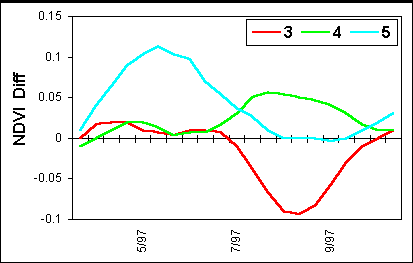 Indice de végétation - Différence par classes entre 1997 et la moyenne 1982-1996