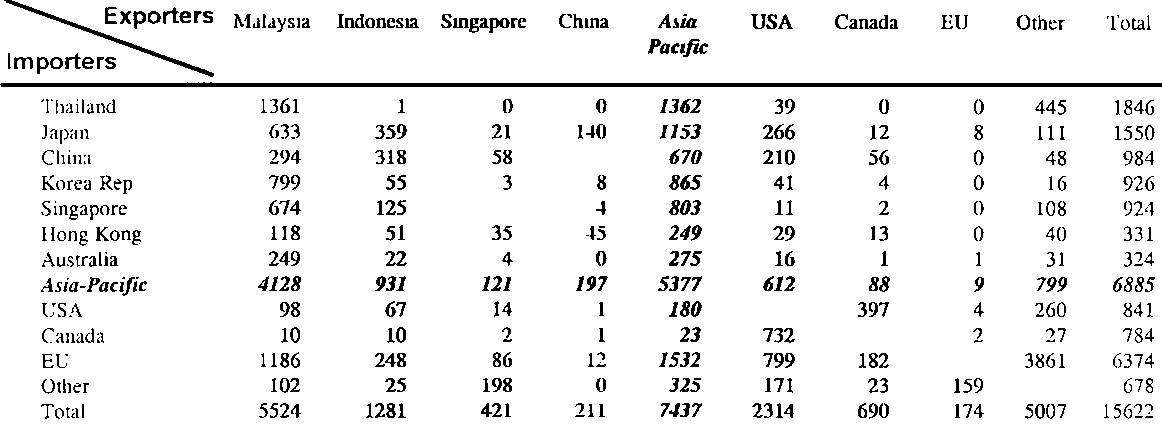 The imports and exports of non-coniferous sawnwood are in Tables 32 and 33. The Asia-Pacific region imported 7 million m3 and exported almost 8 million m3 in 1992, or 43% and 48% of global imports and exports. Thailand led all countries in imports with 1.8 million m3, a 425% increase from 1982, followed by Japan with 1.6 and China with 1.4 million m3. Singapore and the Republic of Korea imported almost 1 million m3 each. Thailand's logging ban, together with its fast growing economy and large furniture and secondary processing industry, are the main reasons for expanded imports. The principal source is Malaysia (74%), followed by Viet Nam and Laos which together account for 24% (Table 34).