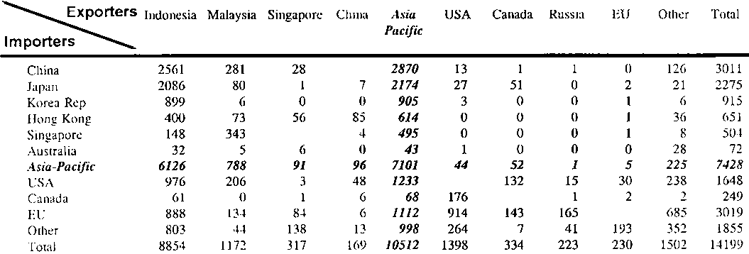 Table 44 shows the direction of trade in plywood in 1992. There are some differences between FAO data and UN Statistics. The latter indicate that China has replaced Japan as the world's leading importer of plywood, most trade activity has been intra-regional. The imports from major countries within the region accounted for 96% of total imports, while exports from within represented two-third of total exports. The main importers of plywood from outside the Asia-Pacific are the United States and the European Union, with about 1 million m3 each.