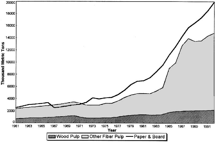 Figure 12. Production of wood pulp, other fibre pulp, and paper & board in China, 1961 - 1992.