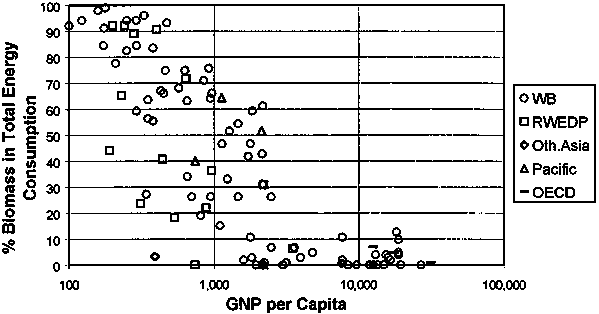 The same may or may not be true for economic changes. With increase in average GNP per capita, changes in energy use take place. This often implies increase in energy use but also a shift from traditional to conventional sources of energy for part of the population, depending on income distribution characteristics. The net effect may be underlying Figure 4 at the end of this chapter, which gives an overview of biomass energy use in relation to GNP per capita. The figure shows a general trend for biomass energy use to decline as GNP increases, but no relationship between incremental changes in the two variables can be deducted from the data. Apart from anecdotal data, income elasticities of woodfuel use are generally not known.