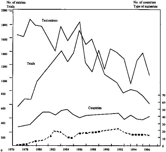 Over the years, INGER has been remarkably successful and popular with NARS breeders. Of the 42,000 lines evaluated, 5,300 have been used as parents by NARS breeders and 429 have been released directly as 618 varieties in 66 countries. In the past, this success has enabled IRRI to attract external funding for INGER, initially by UNDP and latterly by BMZ. However, since 1985, the numbers of entries and the numbers of trials have declined (Figure 5.1) due both to funding constraints and attempts to streamline and make the operation more effective. Trials in Africa have almost ceased. The role of INGER in Latin America has been taken over to some extent by the Fundación Latinoamericana para el Arroz de Riego (FLAR). However, FLAR does not serve all ecosystems or countries in Latin America. Moreover, the position of INGER coordinator at IRRI remains vacant.