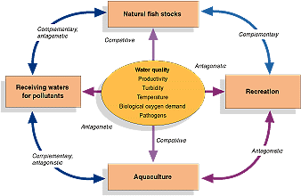 Complementarity between two activities exists when they share the same resource(s) or the same facilities without conflict and when one activity provides inputs to another. For example, there is complementarity when a forest industry supplies timber for boat building or wood for the smoking of fish or when agricultural by-products are used in the feeding of cultured fish.