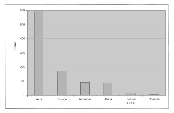 New dams greater than 15 m in height under construction in 1994 (Anon., 1997) numbered 948 and the continental distribution is shown in Figure 10. Asia is foremost, but China ranks fourth after Japan, Turkey and the Republic of Korea, suggesting that the rate of creation of new, large reservoirs is decreasing there.