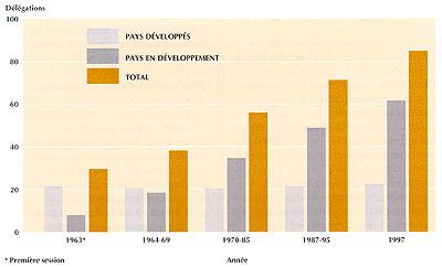 Représentation. La Commission est un organe à représentation internationale. Depuis sa création, elle a tenu 22 sessions, présidées par des représentants des pays suivants: Allemagne, Canada, Etats-Unis, France, Hongrie, Indonésie, Mexique, Pays-Bas, Royaume-Uni, Suisse et Thaïlande. Les vice-présidents ont été élus parmi les délégations des pays suivants: Australie, Canada, Costa Rica, Danemark, Etats-Unis, France, Ghana, Hongrie, Indonésie, Iraq, Kenya, Mexique, Nouvelle-Zélande, Pays-Bas, Nigéria, Norvège, Pologne, Royaume-Uni, Sénégal, Soudan, Suisse et Thaïlande.