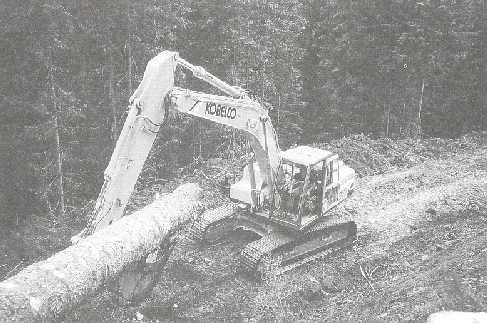 The felling itself, as the landowners responsibility, has to take account of the anticipated method of extraction by the excavator operator with regard to felling direction and harvesting method to be used. A modified full-length method is normally applied as it facilitates log removal from the construction area by excavator most efficiently. This method requires that trees are delimbed and topped at the felling site, except where the trees are too large to be handled by the excavator, when some cross cutting will be necessary.