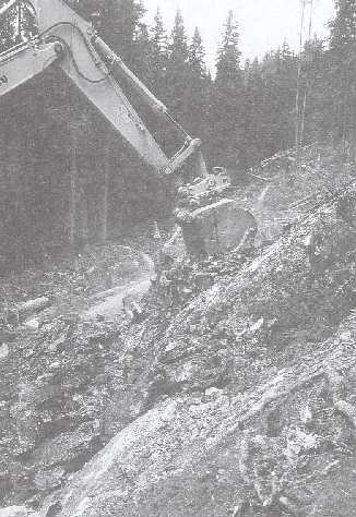Photo 19. Proper blasting technique provides material suitable in size to be incorporated into the road structure while avoiding damage to the forest stands alongside road