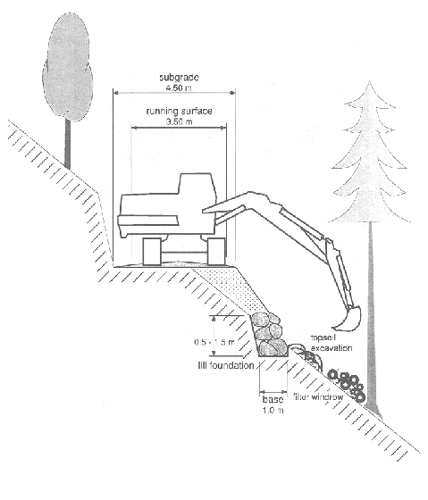 Upon this solid base, boulders are placed by the excavator with accuracy and care, as well as compacted by means of the excavator's bucket in order to build up a solid foundation for the fill. The establishment of a fill foundation reduces the length of fill slopes considerably and makes road construction in steep terrain feasible. This feature is of great importance when side slopes exceed 40 percent as balanced road sections can be achieved with considerably less excavation (FAO, 1989).