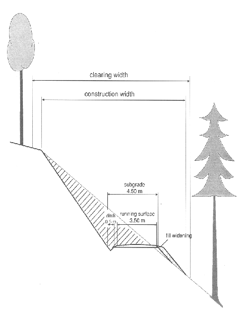 In contrast, applying traditional side cast techniques by bulldozer the length of the fill slope would amount to about 3.5 m, 12 m and 22 m for slope gradients of 45 %, 60 % and 70 %, assuming an angle of repose for side cast material of about 37º, and on slopes of over 75 % a fill cannot be established at all (Gorton, 1985). It is suggested that a balanced road design provided by excavator construction results in approximately 25 to 35 percent less excavated material compared to the traditional side cast technique by bulldozer where most of the road width is cut into the stable hill side (FAO, 1989).