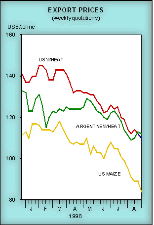Export prices of nearly all major coarse grains have also weakened considerably in recent weeks. By late August, the US maize export price fell to a 10-year low of nearly US$84 per tonne. At this level, US maize prices were US$19 per tonne lower than in May and US$31 per tonne, or 27 percent, below August 1997. Similarly, barley and sorghum export prices have also weakened substantially compared to the previous year. Several factors are behind the ongoing slide in coarse grain prices, namely the relatively large maize and barley stocks carried over from the previous season, particularly in the EC and the United States; favourable weather conditions leading to bumper crops, especially in the major exporting countries; large supplies of more competitively priced, low quality wheat which could be used for feed; and weak import demand, partly fuelled by the continuing financial difficulties facing several countries in Asia. Correspondingly, in the CBOT futures markets, maize prices have continued to decline. In August, the nearby September futures plunged to their lowest value in 10 years while December futures also continued to slide and, by late August, were quoted at US$81 per tonne, some US$26 per tonne below the value of the December 1997 contract quoted in August 1997.