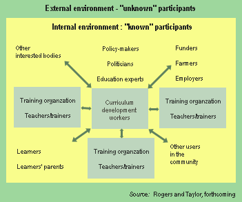 Any agricultural education and training programme is set within a particular social context which is constantly changing. It is therefore important to ensure that the context can influence the development of the curriculum. This means that the list of stakeholders is not fixed and unchanging. Although it may be assumed that all the stakeholders have been identified during the PCD process, there is always the possibility that some have been omitted, that some may emerge later or that changes in society will create new stakeholders with an interest in a programme. The possibility for new stakeholders to become involved at any stage in the process should be created, so that they can be drawn in as a programme evolves.