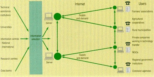 In Chile and Mexico, computer technology was applied in a participatory manner to establish information networks for agricultural producers and farmer associations. The networks provided essential data on crops, inputs, prices, markets, weather conditions, social services, credit facilities, etc. Messages were generated, processed, transmitted through low-cost computers via the Internet and delivered to farmers' organizations, cooperatives, town councils, etc., which were equipped with computers, modems and printers (Figure).