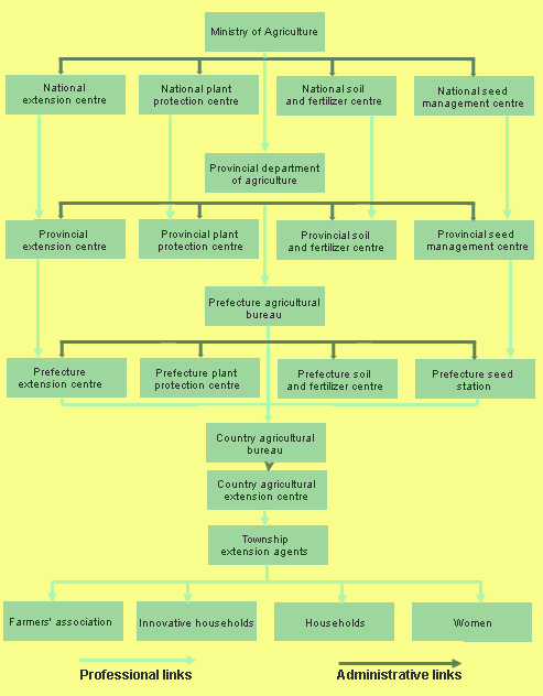 With the establishment of a market economic system, the market is playing an increasing role in the decisions of government bodies. To meet the challenges to extension mentioned in the previous section, the government must revise the former structure and improve approaches to extension. After reviewing the development programmes of the last two decades, the following changes have been made by central and local governments: