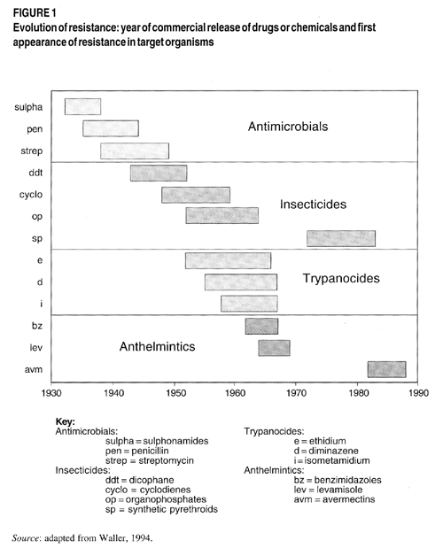The repeated use of chemicals as pesticides or chemotherapeutic agents inevitably leads to the development of resistance in the target organisms. Figure 1 clearly illustrates that resistance systematically occurs within approximately ten years following the introduction of antimicrobials, insecticides, trypanocides and anthelmintics to the market (Waller, 1994). This also occurred with the trypanocidal drugs, such as isometamidium chloride (ISMM), the homidium salts and diminazene aceturate, which were introduced during the 1950s; the first reports of acquired resistance were published during the 1960s (Finelle and Yvore, 1962; Jones-Davies and Folkers, 1966; Na'Isa, 1967; Jones-Davies, 1967). Quinapyramine was marketed earlier, but was withdrawn in 1976 because of resistance and toxicity problems. It was later reintroduced for use in camels and horses and may still be used in error in cattle in some locations.